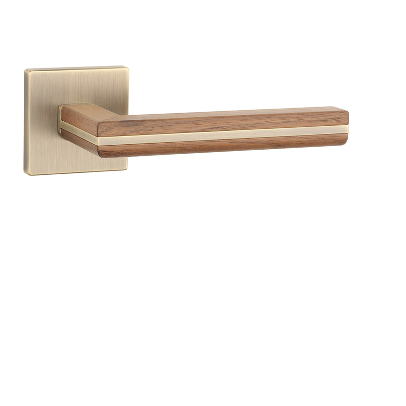 Rozetová kľučka CYRILLA na interiérové dvere s hranatou rozetou je vyrobená z materiálov vysokej kvality - zamak a je povrchovo upravená. Kľučka pôsobí štýlovo a modernisticky, čo podčiarkuje aj kombinácia patiny s drevom. Tento dekoračný prvok jej dodáva unikátny vzhľad a navodzuje príjemný pocit tepla a prírody.