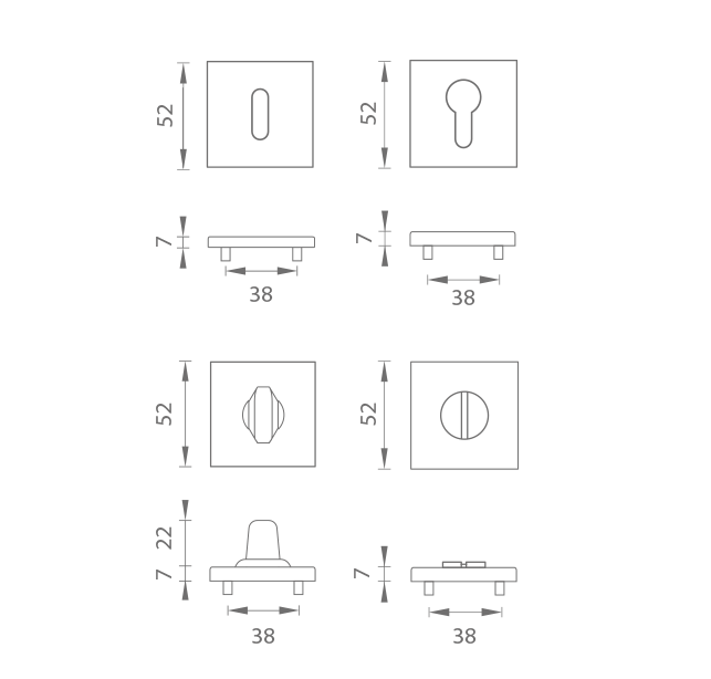 Prevedenia: oválny otvor pre interiérový kľúč (BB), otvor pre cylindrickú vložku (PZ), WC set s vmontovaným kľúčom. Balenie obsahuje 2 kusy roziet (pár) a rozety WC sú v balení ako set.