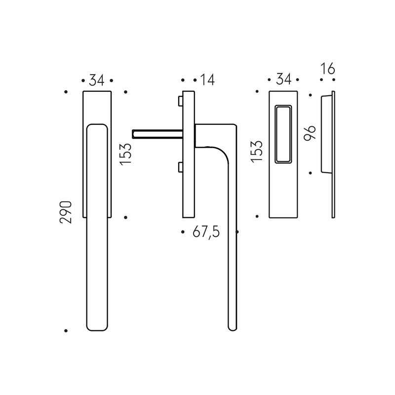 Kľučka má dĺžku 2290 mm a hranatá rozeta má rozmery 34 mm x 153 mm a hrúbku 14 mm.