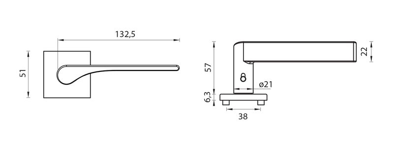 Rozetová kľučka na interiérové dvere s hranatou rozetou je vyrobená z materiálov vysokej kvality - zamak a je povrchovo upravená. Rozeta má rozmery 51 mm x 51 mm a hrúbku 6,3 mm.