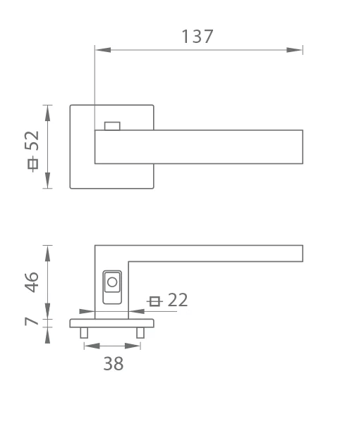 Rozetová kľučka na interiérové dvere s hranatou rozetou je vyrobená z materiálov vysokej kvality - zamak a je povrchovo upravená. Rozeta má rozmery 52 mm x 52 mm a hrúbku len 7 mm.
